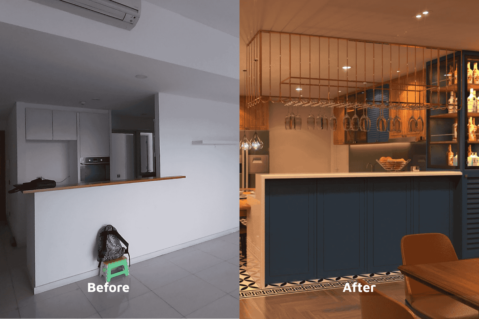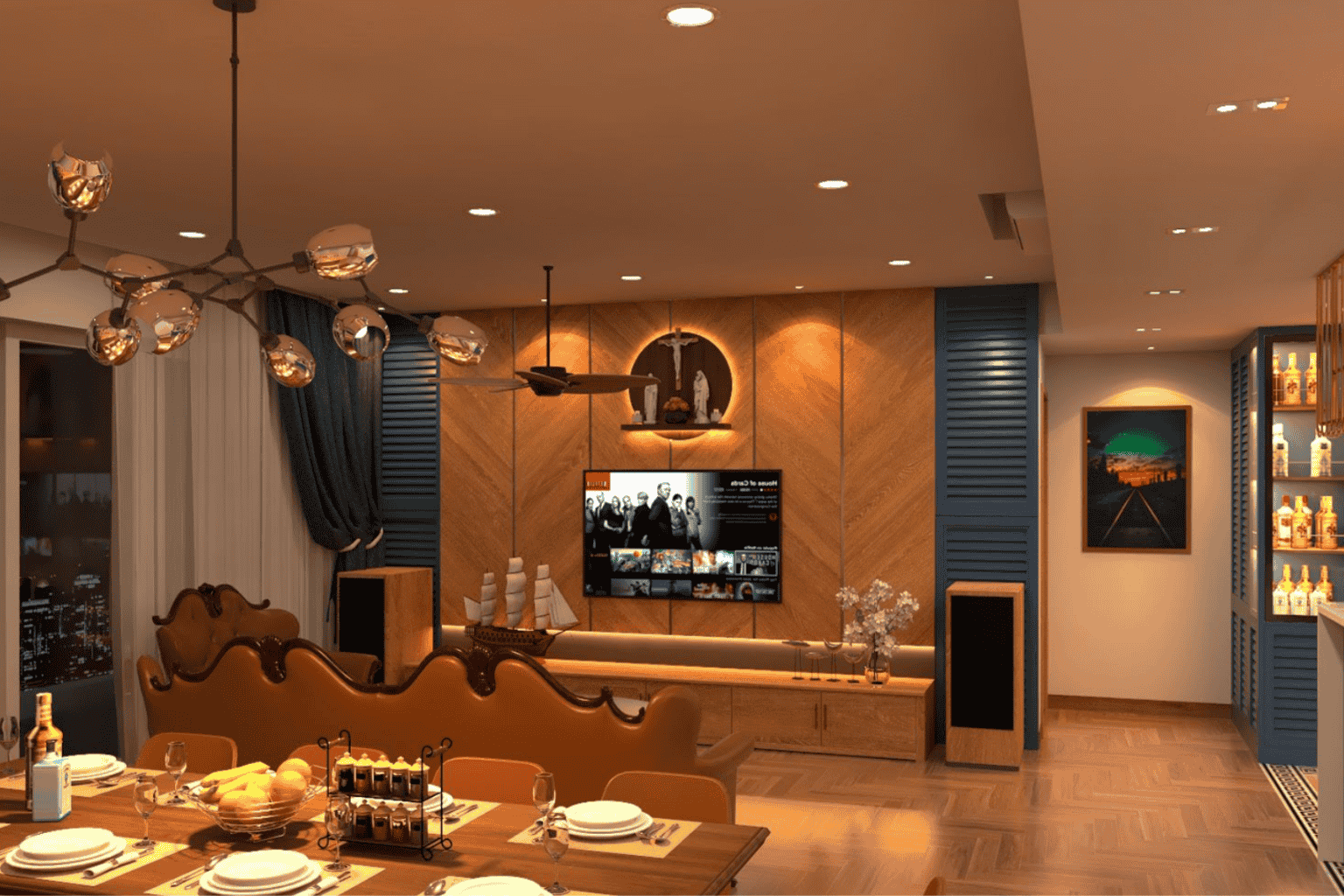 Ngay từ khu vực phòng khách – bếp, sự kết hợp giữa chất liệu gỗ ấm, hệ tủ trưng bày rượu và ánh sáng vàng tạo nên một bầu không khí vừa sang trọng, vừa gần gũi. Không gian không chỉ để sinh hoạt, mà còn là nơi tận hưởng – nơi mỗi chi tiết đều góp phần tạo nên cảm xúc.