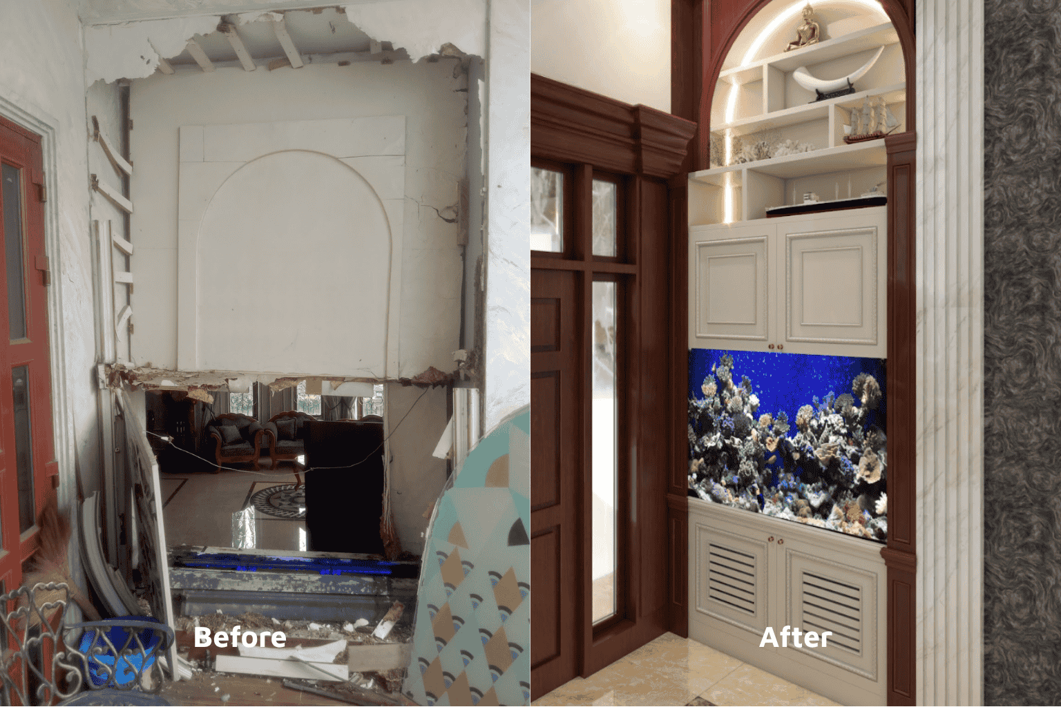 Tủ hồ cá đóng vai trò như một “trung tâm thị giác” khi bước vào không gian.