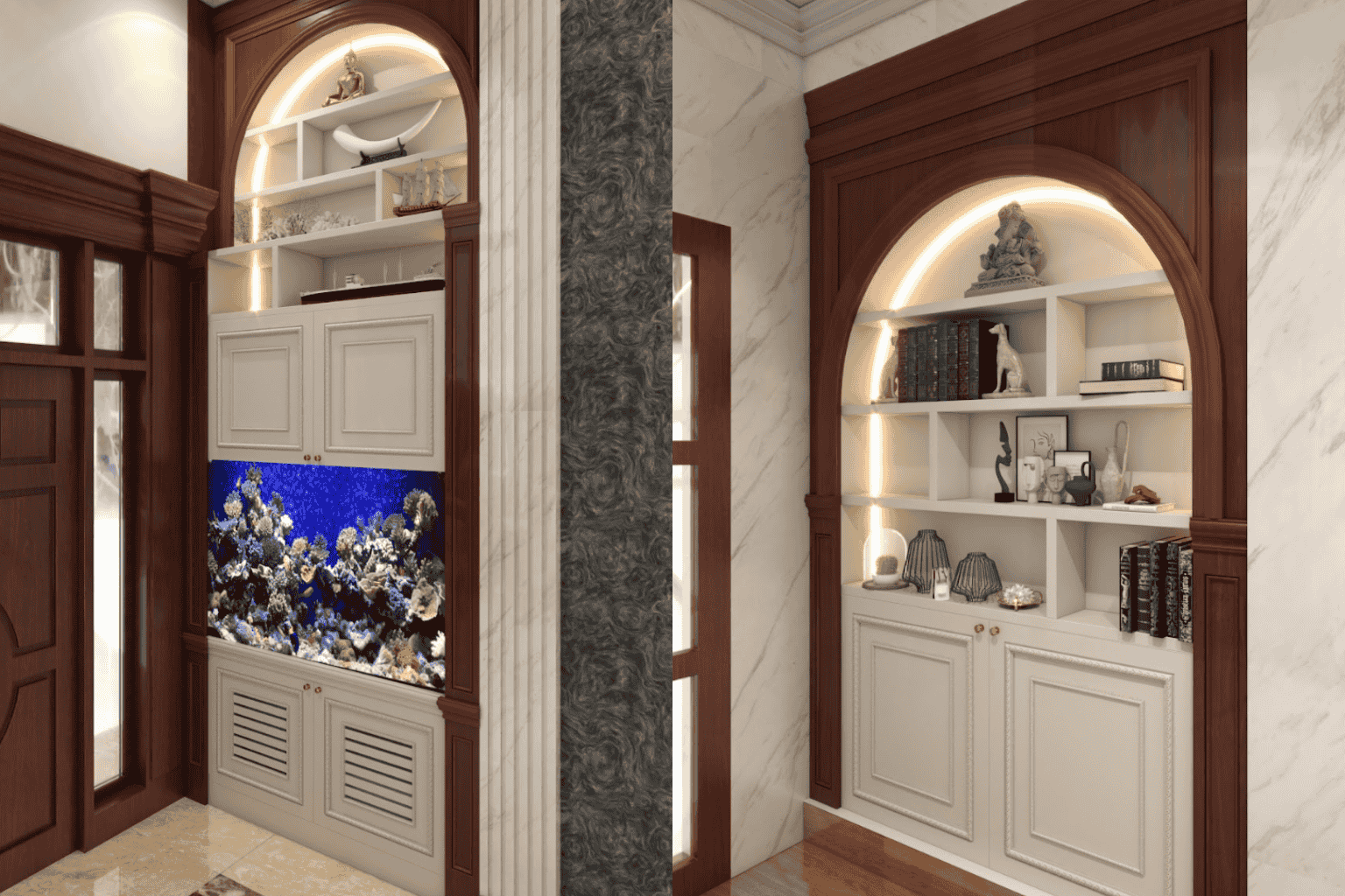 - Thiết kế âm tường với khung gỗ bo vòm mang phong cách tân cổ điển