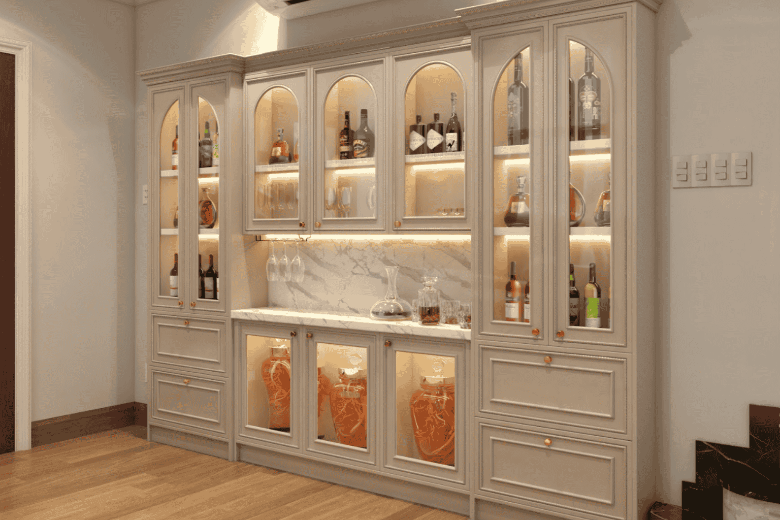 Hệ tủ rượu được thiết kế như một không gian trưng bày cao cấp, thể hiện gu thẩm mỹ và đẳng cấp của gia chủ.