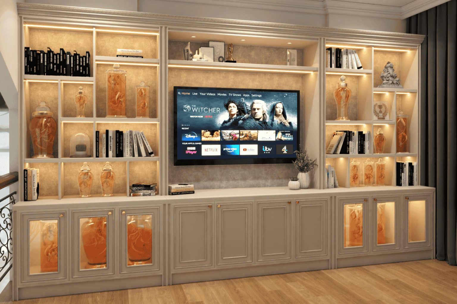 - Kết hợp ánh sáng LED âm tủ để làm nổi bật từng chi tiết trưng bày