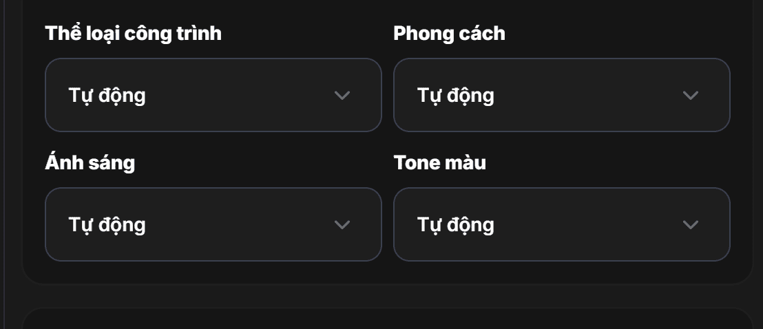 Bước 5: Thiết lập: Thể loại công trình - Phong cách - Ánh sáng & Tone màu.
