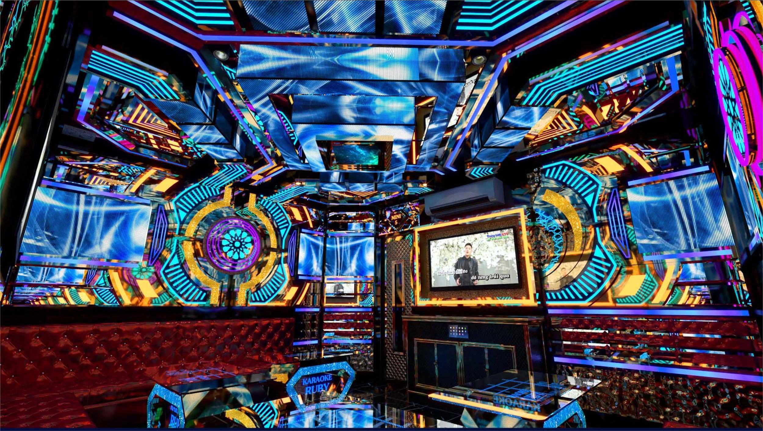 Hình 1. Mẫu phòng karaoke hiện đại tại Ruby – thiết kế nổi bật với hiệu ứng ánh sáng đa tầng, tạo chiều sâu và cảm xúc cho không gian