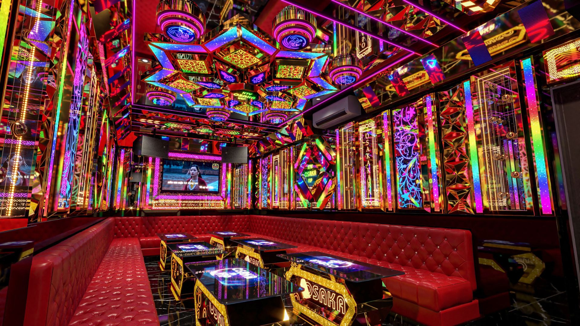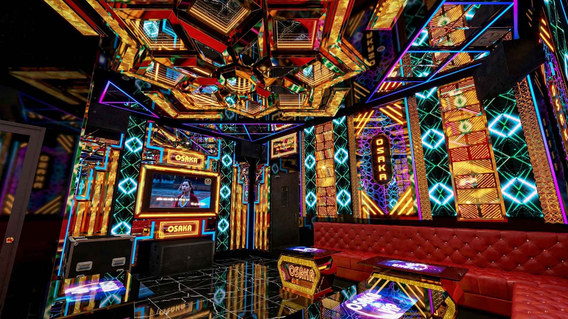 Trần nhà được trang trí bằng hệ thống đèn neon đa sắc màu hình khối kim cương lấp lánh, tạo hiệu ứng vô tận nhờ gương phản chiếu. Các bức tường được bao phủ bởi họa tiết neon rực rỡ với tông màu đỏ, xanh, tím xen lẫn, mang đến cảm giác như đang lạc vào một vũ trụ âm nhạc sống động. Ghế sofa da đỏ cao cấp uốn cong theo hình chữ U, kết hợp với bàn thấp neon phát sáng chữ "OSAKA", không chỉ sang trọng mà còn trẻ trung, khuyến khích sự tương tác nhóm. Đây là mẫu phòng lý tưởng cho những buổi tiệc lớn, với diện tích rộng giúp khách hàng thoải mái di chuyển, hát hò mà không hề cảm thấy chật chội. Sự hiện đại thể hiện qua công nghệ LED lập trình, cho phép thay đổi màu sắc theo nhịp nhạc, biến mỗi buổi hát thành trải nghiệm cá nhân hóa đầy mê hoặc.