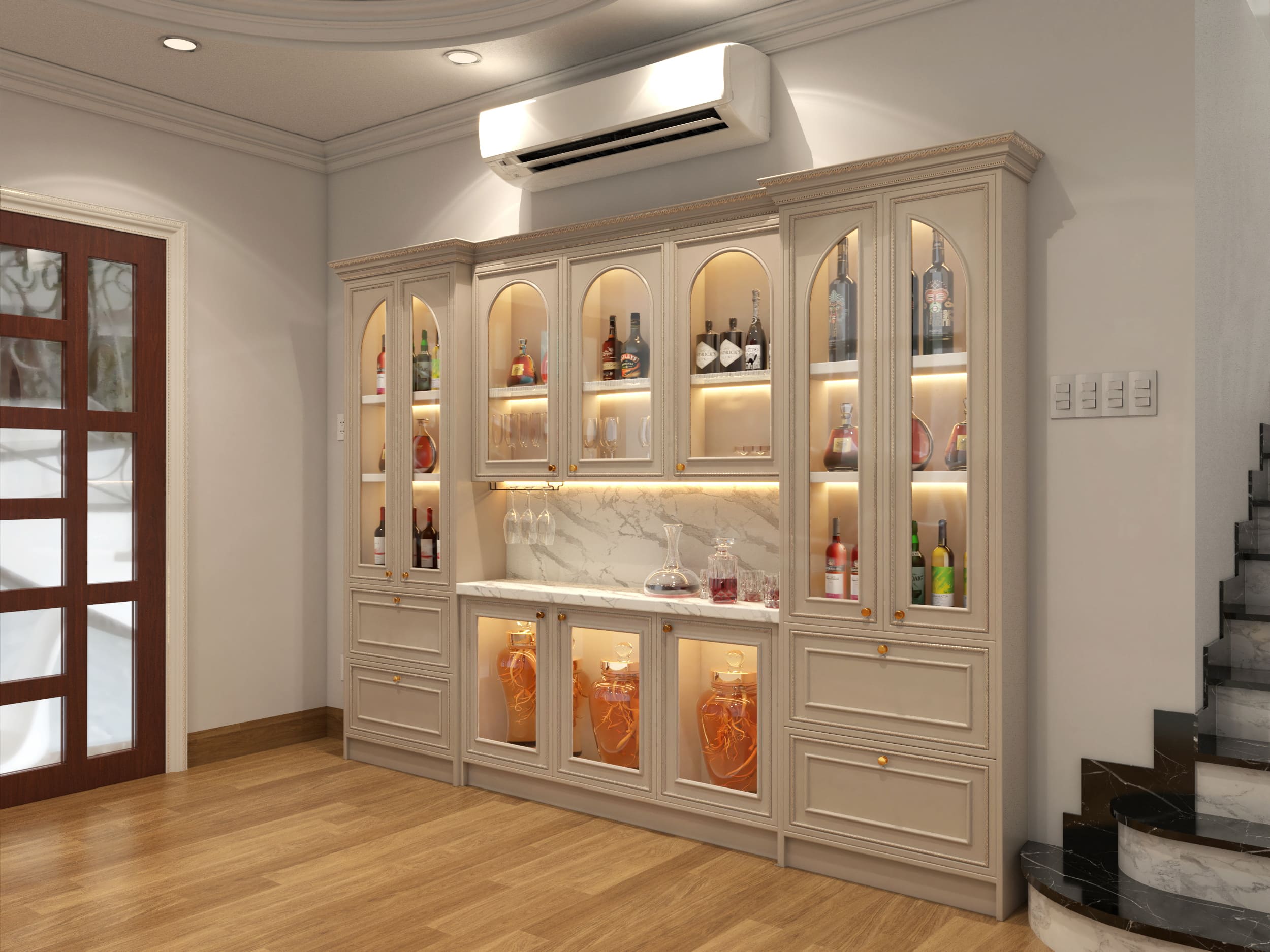 Với những gia chủ có đam mê sưu tầm, một hệ tủ rượu hoành tráng là điều không thể thiếu. Thiết kế vòm kính trong suốt kết hợp cùng hệ thống đèn LED vàng hắt sáng tinh tế đã biến khu vực này thành "spotlight" của căn nhà. Từ những chai vang ngoại sang trọng đến những bình rượu ngâm truyền thống cỡ lớn, tất cả đều được bố trí một cách có tính toán, tạo nên một góc trưng bày vừa bề thế, vừa thể hiện gu "chơi" đồ cực chất của chủ nhân.