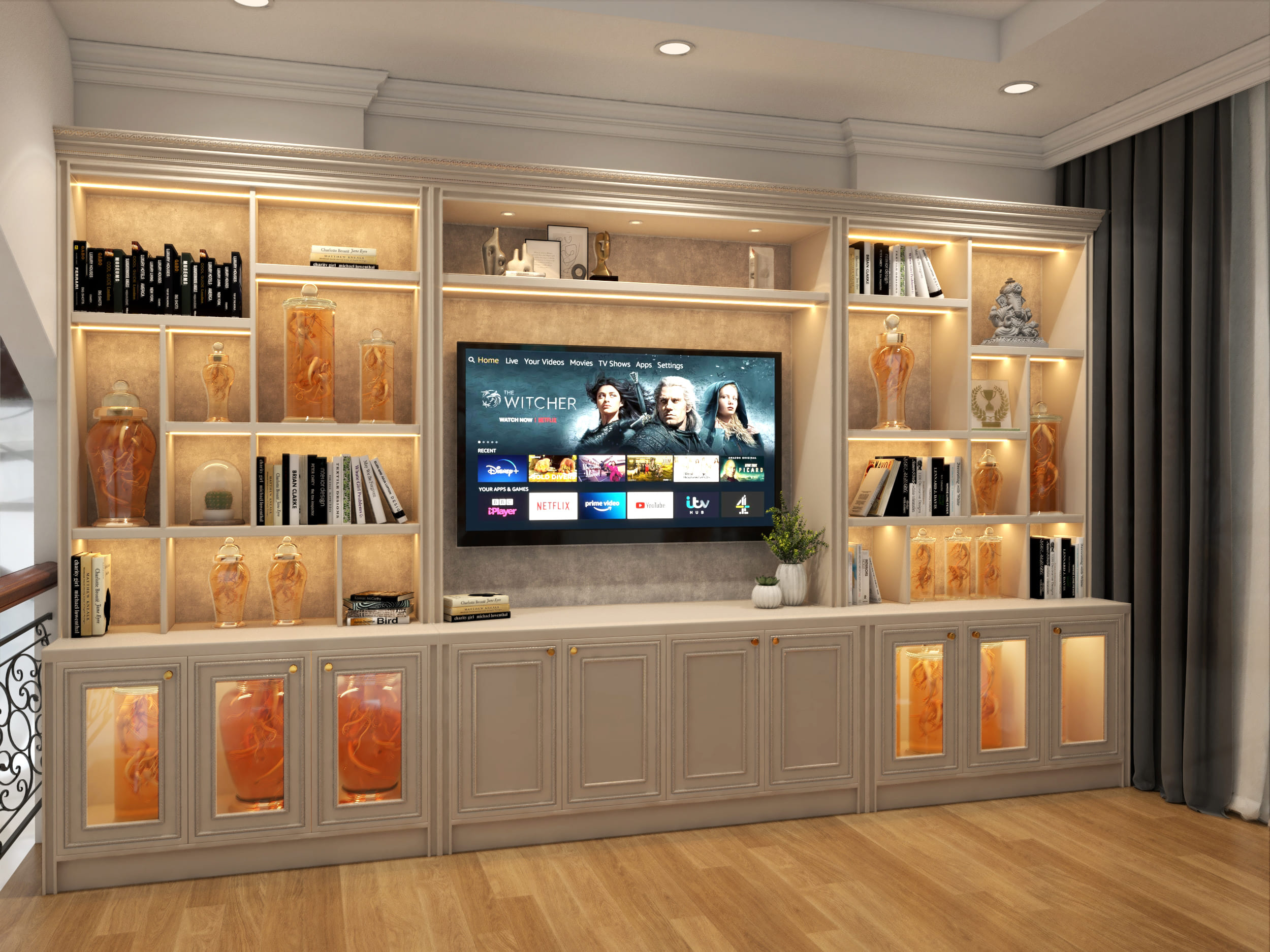 Ngay từ những góc nhìn đầu tiên, hệ tủ trang trí đã gây ấn tượng mạnh với thiết kế vòm cong mềm mại, phá vỡ đi sự cứng nhắc của các khối gỗ lớn. Sự kết hợp hoàn hảo giữa tone màu kem trang nhã và viền gỗ nâu trầm mang đến một visual cực kỳ ấm áp nhưng không kém phần quyền lực. Đặc biệt, việc tích hợp hồ cá sinh động ngay giữa hệ tủ không chỉ chuẩn phong thủy mà còn thổi bừng sinh khí cho toàn bộ không gian.