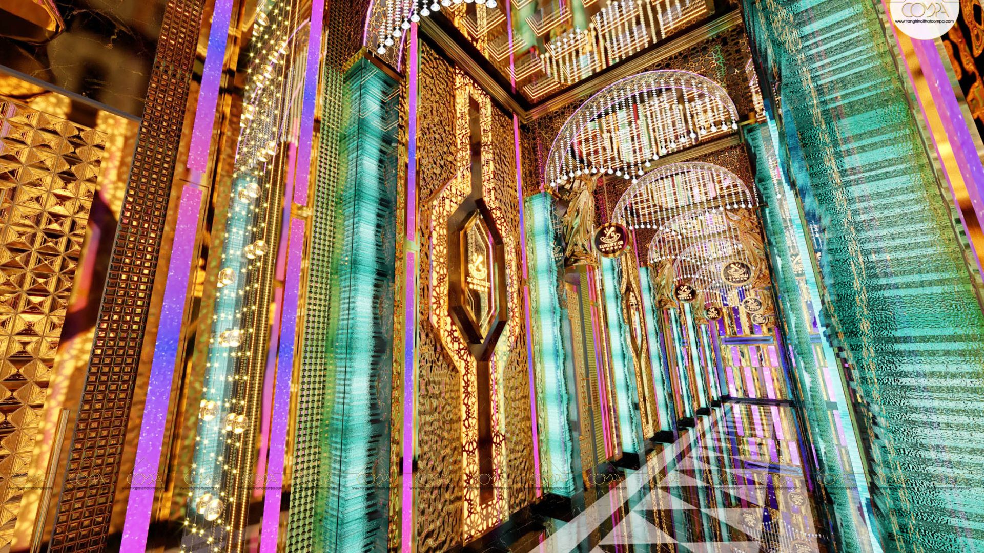 Hành lang dẫn vào các phòng hát được thiết kế như một dải pha lê chuyển ánh sáng theo từng bước chân. Mặt sàn lát gạch họa tiết kiểm, phản chiếu bóng đèn pha lê trên trần. Các vòm dẫn sáng LED, cùng với các hoa văn nghệ thuật tạo nên không gian dẫn đường "sống ảo" sang chảnh. Mỗi bước đi sẽ là một khoảng khắc đáng nhớ của khách hàng.